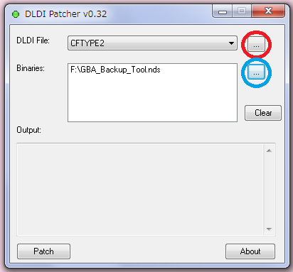 2015/09/09 Category : 覚え書き GAME編 DLDI Patcher使い方 マジコン用アプリをCYBERコードフリークのndsランチャー機能で起動可能化パッチあて 必要なツールDLDI Patcher [Download]コードフリークtypeIII用DLDIパッチ [Download]コードフリークtypeII用DLDIパッチ [Download]PC使い方dlditool32.exeを起動します。画像の赤丸をクリックしDLDIパッチの置かれているPCのフォルダーを選択し青丸をクリックしPC上のパッチをあてたい拡張子ndsファイルを選択。左下の[Patch]をクリックでOutputの欄にPatched successfullyと表示されれば完了です。おまけマジコン用のDLDIもあるみたいです気になる方は覗いてみては?http://chishm.drunkencoders.com/DLDI/ [2回]