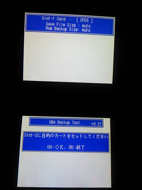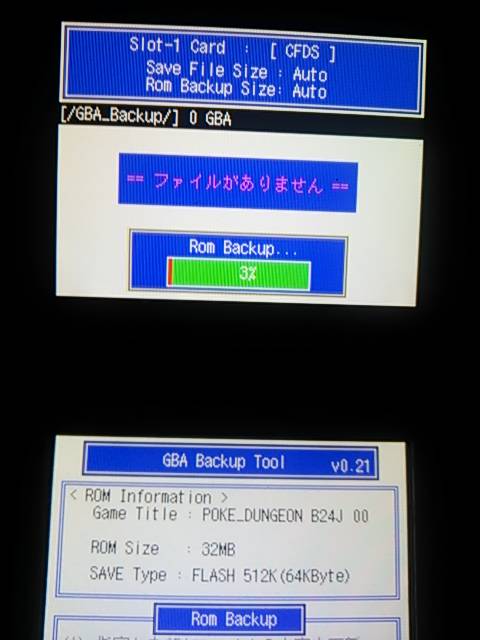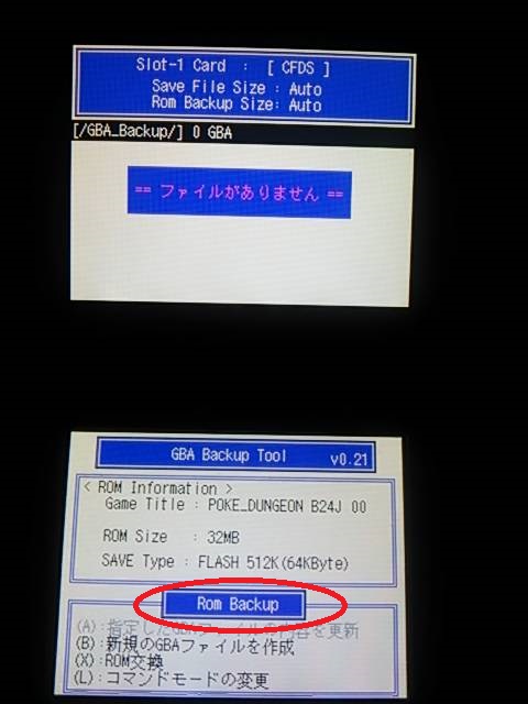 2015/09/09 Category : 覚え書き GAME編 GBA吸い出し CYBER・コードフリークtypeII (DS/DS Lite用) 必要なツールGBA_Backup_Tool.nds [Download]CYBERコードフリークDS用 typeII又はtypeIIIDS又はDS Lite本体DSソフト[CYBERコードフリーク起動用]吸い出したいGBAソフトPC使い方GBA_Backup_Tool.ndsにDLDI Patcherでパッチをあてます。※解らない方はコチラを読んで下さい。↓CYBERコードフリークのSD内の任意の場所にGBA_Backup_Tool.ndsを配置↓CYBERコードフリークにSDカードとDSソフトを挿入↓DSにCYBERコードフリークと吸い出したいGBAソフトを挿入↓DSの電源を入れCYBERコードフリークを起動↓オプションのndsランチャーからSDに配置したGBA_Backup_Tool.ndsを選択↓ 起動しましたらGBAソフトは挿入済みですのでAボタンを押します。↓ 赤丸の部分がL/Rボタンで変更できますのでRom Backupに変更しBボタンを押します。↓ 吸い出しが開始されましたら上画面下部の数字が100%になるまで待ちます。↓ 終了しますと画像のピンク丸の様にSD内にGBA_Backupフォルダーが自動作成されフォルダー内に吸い出したGBAファイルが作成されます。吸い出したROMはPCやスマホのエミュでも起動が可能ですので興味がある方はやってみてはどうでしょうか? [9回]